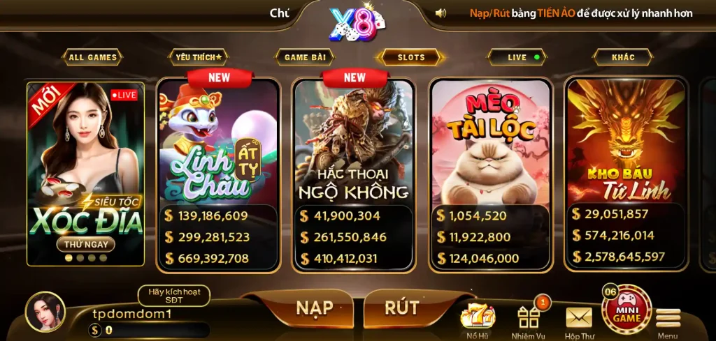X8 không chỉ thu hút người chơi nhờ vào phần thưởng lớn mà còn nhờ vào giao diện dễ sử dụng và hệ thống chơi mượt mà. Các sảnh game, đặc biệt là các trò chơi slot, được thiết kế bắt mắt, với đồ họa sống động và những tính năng bonus thú vị giúp tăng thêm phần hấp dẫn cho trải nghiệm người chơi.